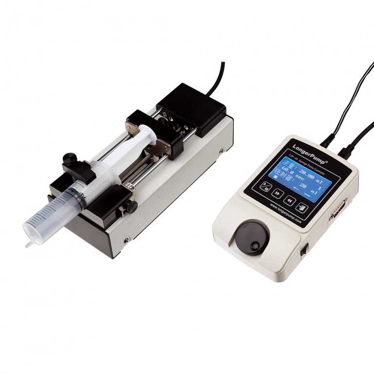 دستگاه پمپ سرنگی دارای یک الکتروموتور می باشد که بصورت خطی عمل می نماید و برای بیرون کشیدن و فشار به درون پیستون سرنگ ساخته شده و هدف از ساخت آن انجام این کار با سرعت ثابت و دقت بسیار بالا می باشد. پمپ های سرنگی در دو گونه پزشکی و آزمایشگاهی ساخته می شوند که نمونه های پزشکی برای تزریق دارو به بیماران به کار می رود و دقت آنها در حد میلی لیتر بر دقیقه می باشد و نمونه های آزمایشگاهی برای تزریق مواد شیمیایی گوناگون به مخازن گوناگون و در آزمایش های گوناگون بکار می رود و دقت آنها در حد نانو لیتر بر دقیقه می باشد. پمپ سرنگی آزمایشگاهی به سه گونه ساخته می شوند :